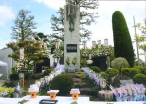 敷地内に建碑された万世特攻慰霊碑「よろずよに」の前にて毎年4月の第2日曜日に慰霊祭が執り行われており、当会からも毎年供花を捧げております。