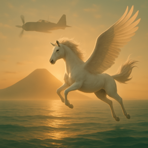 開聞岳上空を飛ぶ特攻機とペガサス(自由と繁栄の象徴)