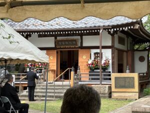 世田谷山観音寺は、生前の鳥濱トメがここに祀られている観音様と同じ観音像を開眼して知覧でお祀りするために何度か足を運んだというご縁がある寺院です。知覧特攻の母鳥濱トメ顕彰会からは、会員皆様の会費や寄付金によりお花を供えさせて頂きますとともに、理事長、事務局長、会員複数名によりお祈りを捧げて参りました。また、当会が共催させて頂いておりますカートエンターテイメントプロデュース舞台「帰って来た蛍」の製作者・出演者ご一同様も供花をされますとともに、出演された俳優の方々が参列されました。